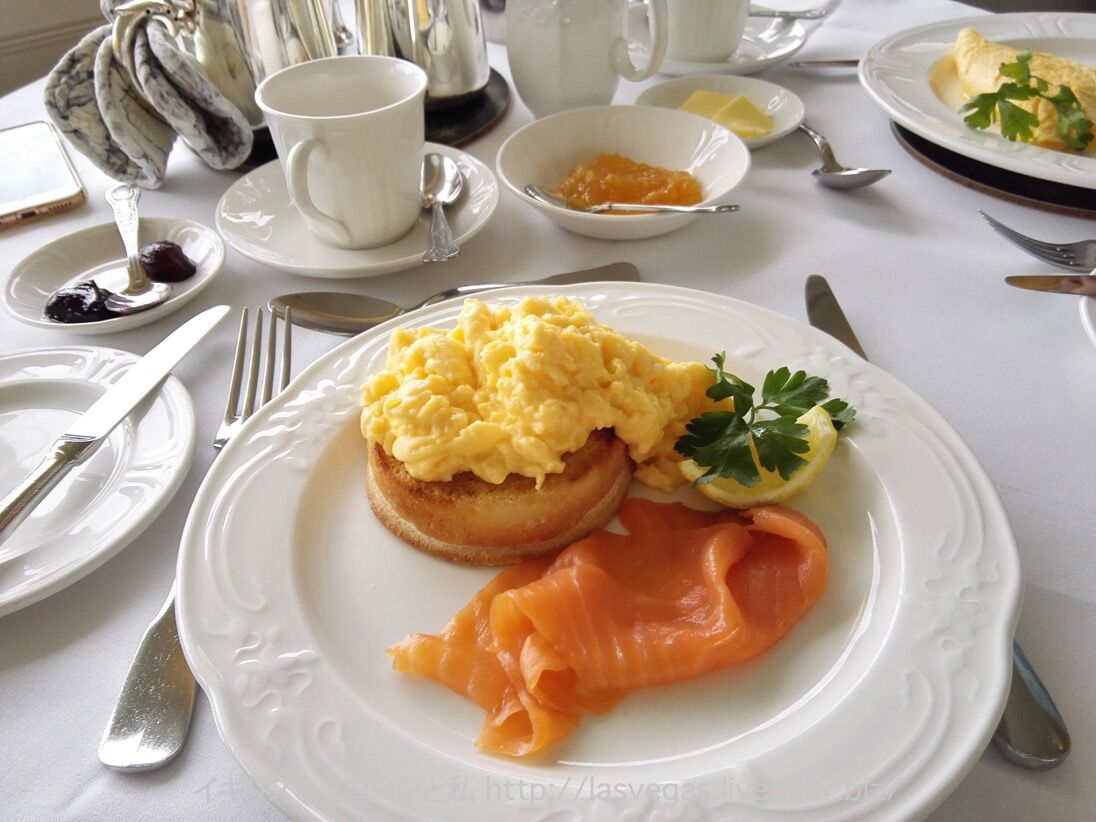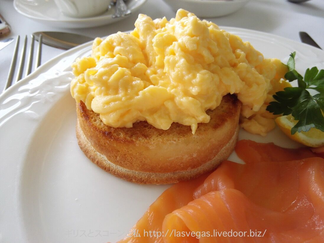 イングリッシュマフィンの上に、トロトロのスクランブルエッグ。肉厚なサーモンが添えられていて、盛り付けも素敵!
