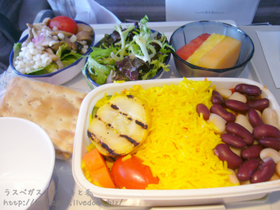4月のマカオ&香港旅行記も、これで最後となりました。少々出発が遅れたJALに乗り込んだら、今回も事前に指定しておいた2階のお気に入りシートに座るいとこ夫婦。帰りも満席に近い混雑度でしたが、狭いけど静かでとても快適。いとこの機内食は、帰国便もベジタリアンミールです♪